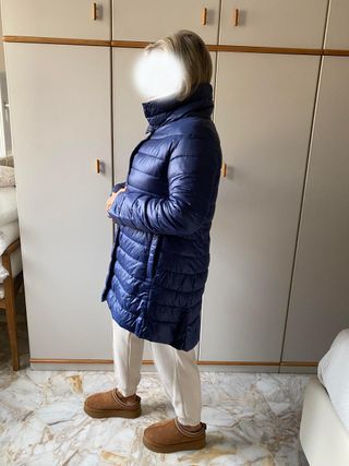 Piumino leggero (lightweight) perfetto per la mezza stagione. Design: Modello svasato (forma ad A) molto elegante. Collo: Alto e avvolgente (funnel neck), protegge dal freddo. Colore: Blu Navy Lucido/Brillante. Chiusura: Bottoni a pressione. Condizioni: Pari al nuovo. Taglia: M