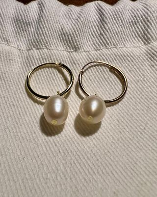 Eleganti orecchini con perle pendenti. - Montatura a cerchio dorata. - Perle bianche naturali.
