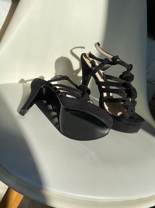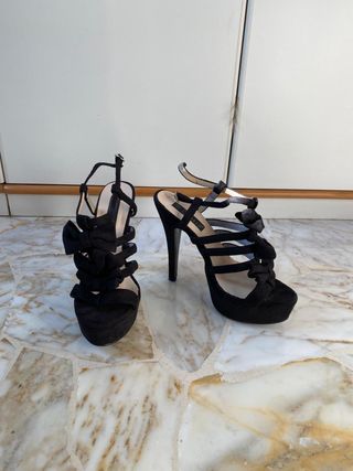 Sandali donna con fasce frontali decorate con maxi fiocchi in tessuto scamosciato (o effetto scamosciato) nero. Chiusura con cinturino alla caviglia. Tacco a spillo alto e sottile, con plateau per un maggiore comfort e stabilità. Ottime condizioni (come da foto), usati pochissimo.