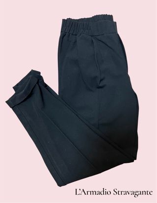 Bershka pantaloni con pence vita elastica • Modello: hanno una linea semplice e pulita, con gamba leggermente affusolata verso il fondo. • Vita: elastica, quindi comoda e adattabile, senza cintura visibile. • Dettagli: presentano pieghe frontali leggere che conferiscono un aspetto più elegante e sartoriale. • Tessuto: liscio cotone • Stile: possono essere considerati versatili, adatti sia per un look casual-chic con sneakers e t-shirt, sia per un outfit più elegante con camicia e scarpe formali. Taglia M