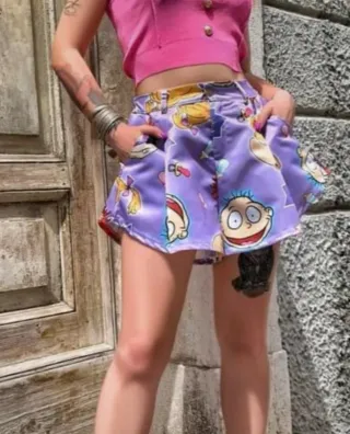 Shorts da donna a farfalla con una divertente fantasia ispirata ai cartoni animati. - Vita alta. - Tessuto satinato. - Stampa colorata.