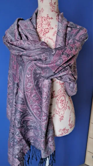 Elegante foulard di grandi dimensioni con fantasia. - Design dupleface. - Motivo paisley e geometrico. - Bordi con frange.