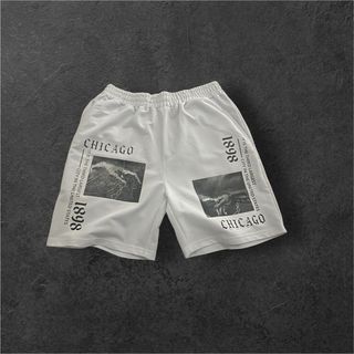 Pantaloncini bianchi con stampa grafica stile streetwear. - Stampa CHICAGO 1898 - Dettaglio IT IS THE THIRD LARGEST CITY IN THE UNITED STATES - Tessuto confortevole