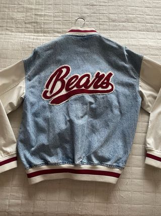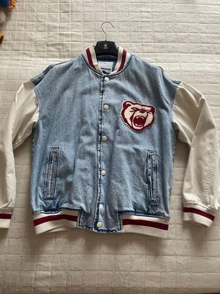 Giacca stile college con un design unico. - Corpo in denim blu. - Maniche in tessuto bianco. - Patch a forma di orso sul petto. - Polsini e colletto a costine con strisce bordeaux.