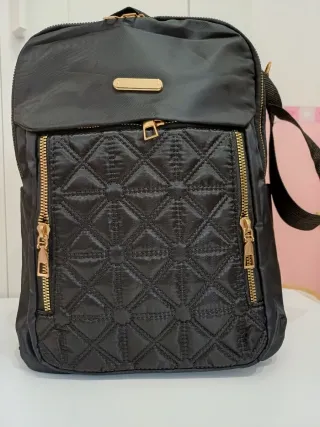 Zainetto da donna dal design moderno e alla moda. - Colore nero. - Dettaglio trapuntato sul davanti. - Zip dorate. - Placca metallica dorata sul davanti.