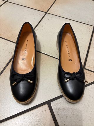Eleganti ballerine nere con un grazioso fiocco sul davanti. - Tomaia in vera pelle. - Dettaglio con puntali dorati sul fiocco. - Suola in gomma. Praticamente nuove, usate 3 volte e tenute nella loro scatola.