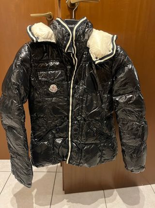 Elegante giacca Moncler da donna, dal finish lucido e un tocco di bianco. - Design trapuntato. - Dettagli a contrasto bianchi. - Logo Moncler applicato.