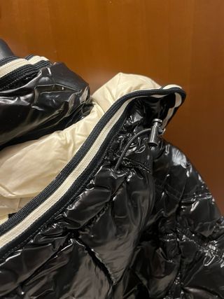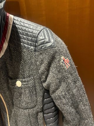 Giacca Moncler da donna in tessuto. - Tessuto tipo “cappotto” - Inserti in materiale tecnico. - Dettagli a contrasto su polsini e fondo - Cerniere da sistemare