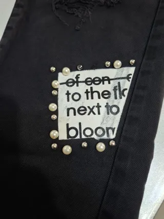 Jeans neri da donna con dettagli unici. - Design strappato. - Applicazioni di perle decorative. - Patch con scritta. - Vita alta.