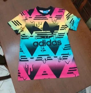 Maglietta Adidas con un design unico e colorato. - Fantasia geometrica e dripping. - Logo Adidas Trifoglio. - Maniche corte.