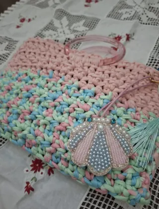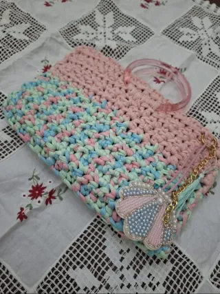 Bustina realizzata all'uncinetto con filato tinto sfumato. - Decorazione a forma di conchiglia con perline e cristalli. - Manico rigido trasparente. - Dettagli con nappe colorate.