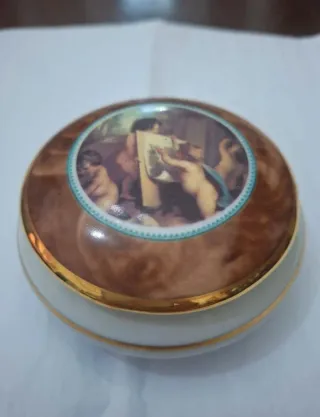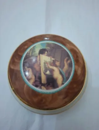 Elegante portagioie in porcellana, un pezzo pregiato. - Decorazione con scena di putti. - Bordatura in oro. - Finitura effetto legno sul coperchio.