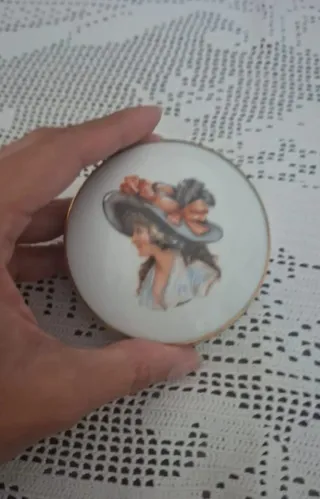 Elegante portagioie in porcellana, con un'illustrazione di una donna con cappello. - Decorazione con profilo femminile. - Bordo dorato.
