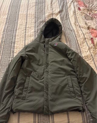 Giubbotto K-Way con cappuccio, colore verde oliva. - Logo K-Way sul petto. - Tasche laterali. - Chiusura con zip.