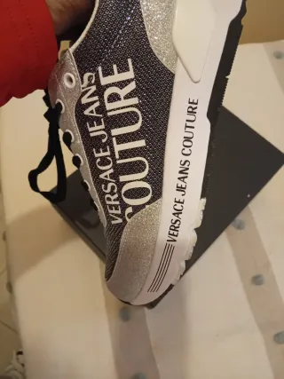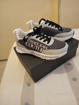 Eleganti scarpe da ginnastica Versace Jeans Couture da donna. - Design scintillante con dettagli neri e argento. - Logo Versace Jeans Couture stampato sul lato.