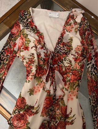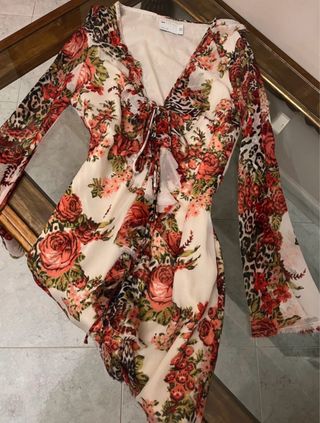 Abitino da donna con stampa floreale e animalier. - Scollo a V con laccetti. - Maniche lunghe. - Tessuto leggero e svolazzante.