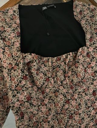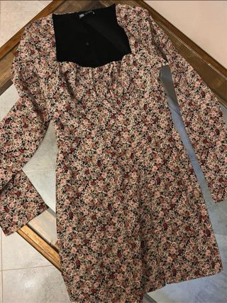 Elegante abito Zara con fantasia floreale. Scollo quadrato e maniche lunghe. - Fantasia floreale su base beige. - Dettaglio nero sul corpetto. - Maniche lunghe.