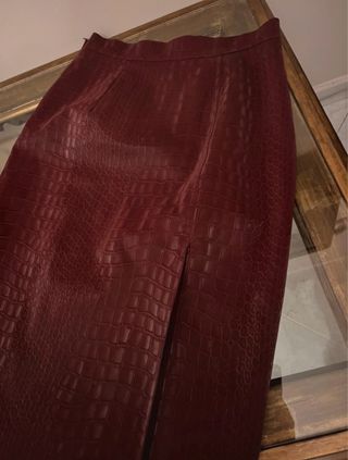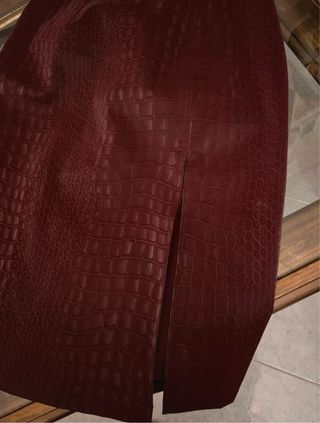 Splendida gonna in ecopelle con un elegante effetto coccodrillo. - Materiale: Ecopelle - Fantasia: Effetto coccodrillo - Dettaglio: Spacco frontale
