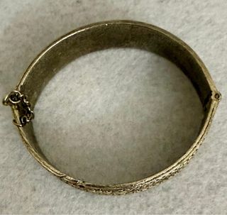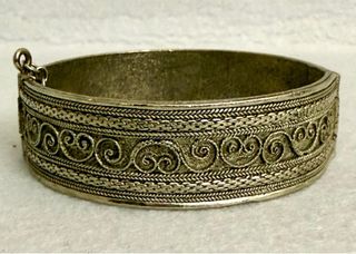 Elegante bracciale antico con finiture dettagliate. - Design con motivi a spirale. - Bordi lavorati a treccia.
