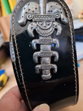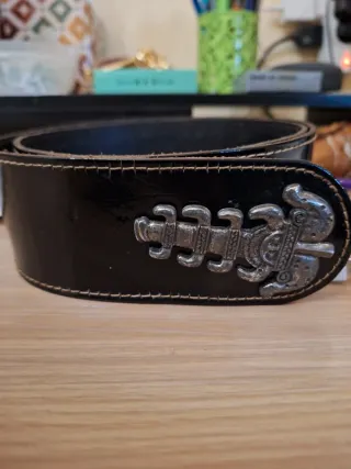 Cintura vintage degli anni '80 con un'originale decorazione in metallo. di vernice nera con bellissimo fermacintura. lunghezza 90-110 con 6 fori ed è alta 6 cm - Design unico con figura stilizzata. - Dettagli in rilievo sulla decorazione. - Cuciture a vista sul bordo.
