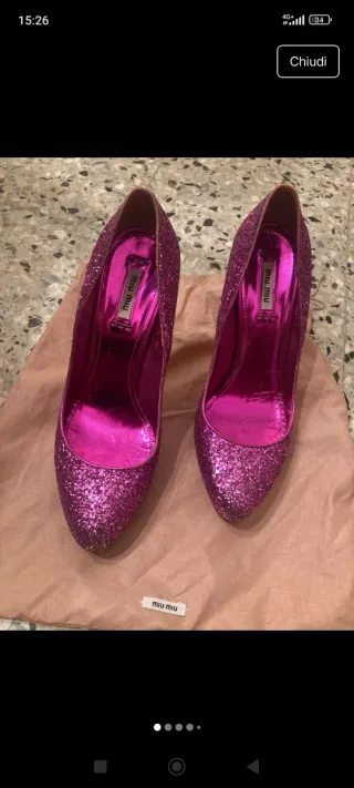 Eleganti scarpe Miu Miu con finitura glitterata. - Colore fucsia brillante. - Design a punta. - Tacco alto12 cm. Dust bag presente