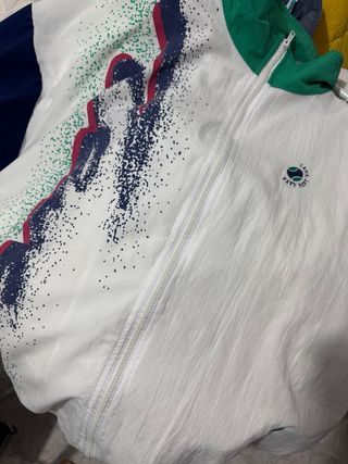 Giacca a vento sportiva con un design unico. - Maniche a contrasto blu e verdi. - Dettagli grafici astratti. - Collo alto con zip. - Tasca frontale. - Polsini e fondo elasticizzati.