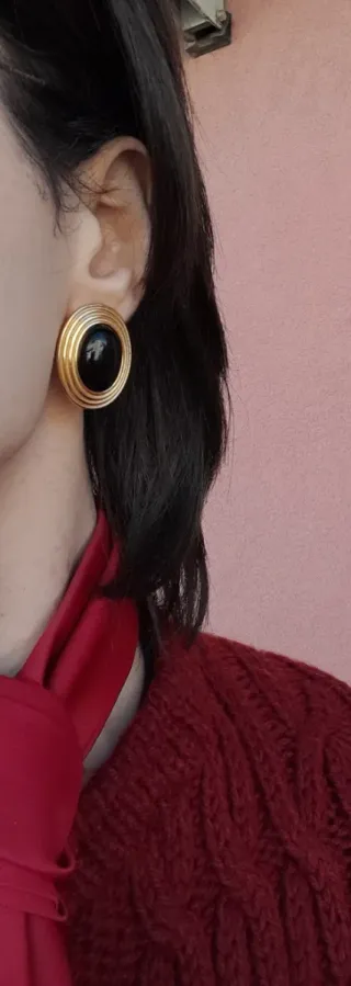 Eleganti orecchini vintage con un design ovale e finitura in acciaio. Orecchini per lobi forati. Qualche difetto sul metallo, ma non si nota granché secondo me. - Dettaglio centrale in pietra finta nera. - Cornice dorata con righe concentriche.