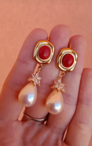 Eleganti orecchini pendenti con pasta di corallo e perla finta. In particolare, sul retro di un quadrato di un orecchino c'è un piccolo graffio. - Montatura in metallo dorato. - Dettagli in zirconi. - Chiusura a monachella.