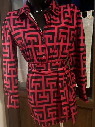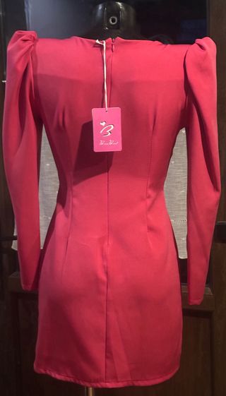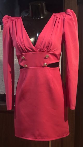 Elegante abito da donna in una vivace tonalità fucsia. Questo capo presenta dettagli che lo rendono unico. - Scollo a V profondo. - Maniche lunghe con spalle a sbuffo. - Cintura con cut-out e bottoni dorati. - Design aderente che valorizza la figura.