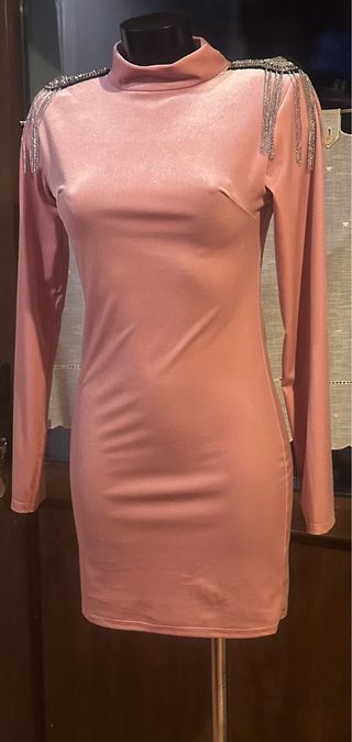 Elegante abito corto con dettagli scintillanti. - Spalline sottili con strass. - Scollo a V incrociato. - Orlo con frange di strass.