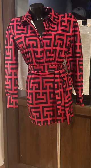 Elegante abito con una vivace fantasia geometrica. - Scollo a V con colletto. - Maniche lunghe. - Cintura in vita per un fit sagomato. - Chiusura con bottoni sul davanti.