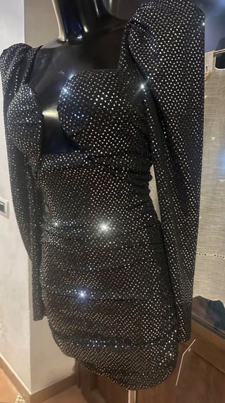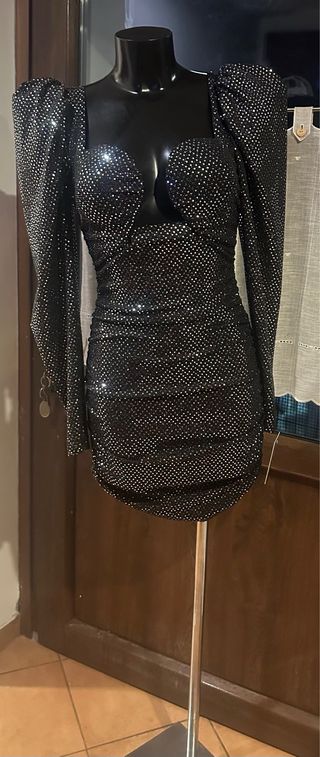 Elegante abito corto con un design scintillante. - Tessuto interamente ricoperto di strass. - Maniche lunghe a sbuffo. - Scollatura a cuore. - Effetto drappeggiato sul fianco.
