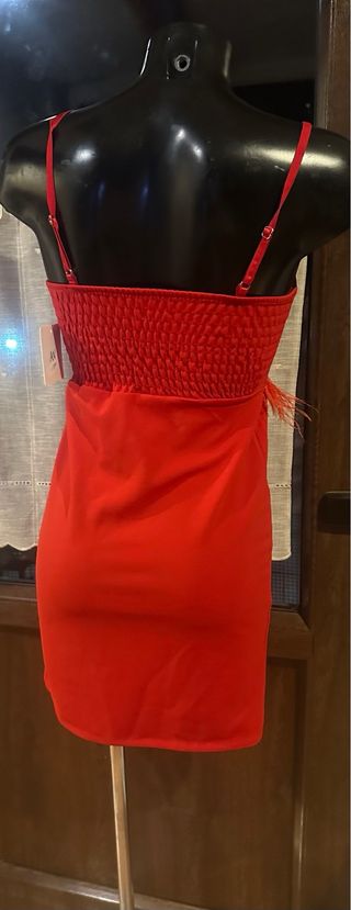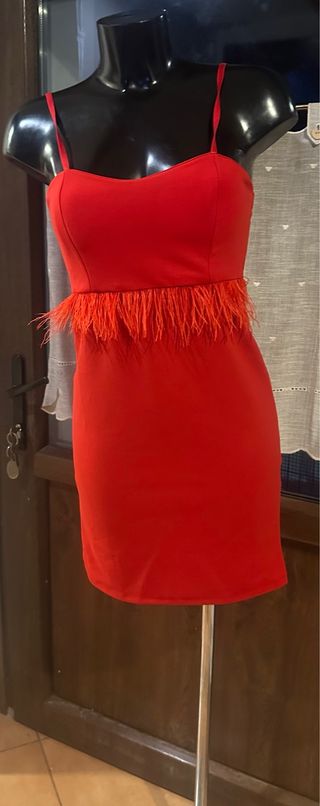 Elegante abito corto con dettagli in piuma. - Spalline sottili. - Bordo in piuma applicato in vita. - Tessuto liscio e aderente.