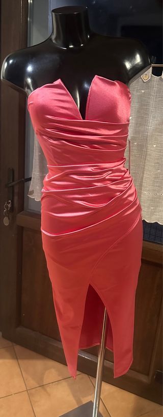 Elegante abito lungo con un design sofisticato. - Tessuto satinato. - Scollo a V profondo. - Effetto drappeggiato sul busto. - Spacco laterale pronunciato.