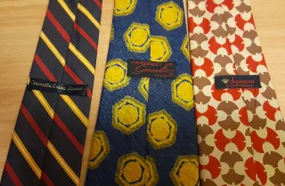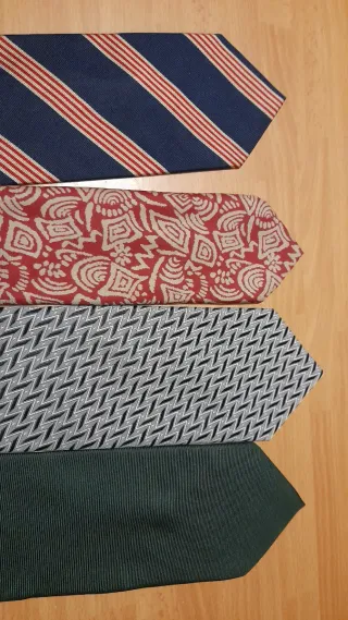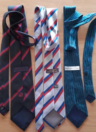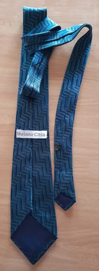Cravatta originale "Metano Città" vintage rara colore ottanio con motivo a spina di pesce grigio e blu, 100% seta Made in Italy ottima per collezionisti di memorabilia aziende. Due cravatte "Associazione Nazionale Carabinieri ": colore grigio con righe oblique rosse e blu, 100% poliestere made in Italy. Nera con righe oblique blu e rosse, logo ricamato a mano, fatta a mano in Italia 100% pura seta. Ottime per collezionisti di articoli militari. Come nuove non hanno difetti.