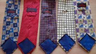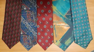 Cinque cravatte vintage Egon Von Furstenberg 100% seta con fantasie classiche e colorate: due cravatte a quadri fantasia floreale, una rossa a pois, una blu e una gialla fantasia geometrica. In ottime condizioni senza macchie solo quella blu ha la cucitura sul retro del codino rifatta a mano.