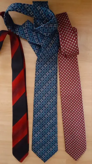 Tre cravatte sartoriali vintage realizzate con cura come da tradizione italiana: Righe rosso/nera made in Italy Duca Milano taglio classico e finiture curate Motivo geometrico blu made in Italy Lo Pappagallo lavorazione artigianale, tessitura ricercata in confezione originale mai indossata Micro pattern bordeaux made in Italy Marco Laurenti cucita a mano in confezione originale mai indossata.