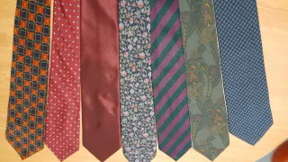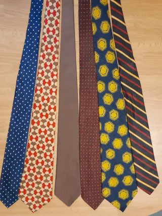 Set di sette cravatte di pura seta, eleganti e di qualità, con fantasie varie: geometriche, micropois,tinta unita, floreale, righe e paisley. In ottime condizioni.