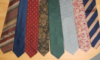 Otto cravatte in pura seta in ottime condizioni. Modelli assortiti e stili misti: righe classiche, fantasie retro, tinta unita, micro pois e motivi geometrici e floreali.