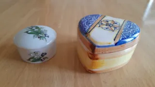 Due scatoline portagioie in porcellana. Quella a forma di cuore è dipinta a mano ed è 8x7,7 cm alta 4,5 cm. L'altra è di porcellana Limoges France diametro 5 cm e alta 3 cm.
