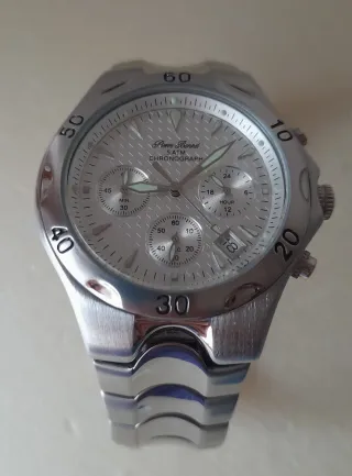 Orologio da uomo vintage in acciaio Pierre Bonnet, water resistant, quadrante bianco e argento. Con cronometro, cronografo, datario tutto perfettamente funzionante. Cinturino lucido e satinato. Mai indossato, nella scatola originale con manuale d'uso e certificato di garanzia naturalmente scaduto. Misura polso 23 cm