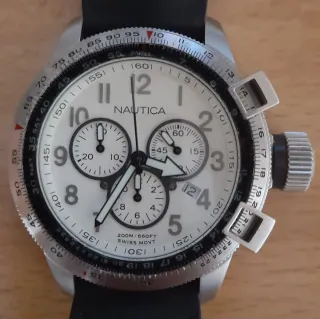 Orologio cronografo da polso uomo Nautica, cassa in acciaio da 46 mm, quadrante bianco, cronometro, lunetta girevole con scala tachimetrica, lancette luminescenti, datario, vetro minerale infrangibile, movimento al quarzo svizzero con cronografo a tre contatori e corona a vite oversize con logo, resistente all'acqua fino a 200 m., cinturino nero. Mai indossato in ottime condizioni senza graffi solo il fondello ha leggeri segni del tempo. Batteria sostituita quindi funzionante. Lunghezza polso 26 cm