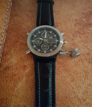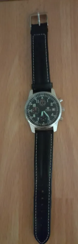 Orologio da uomo King Quartz cronografo con movimento al quarzo, datario, quadrante nero e cinturino pelle nera, lancette fluorescenti visibili al buio. Funzionante con batterie nuove. Mai indossato, non ha graffi e il cinturino ha lievi segni del tempo. Polso 26 cm e quadrante 40 mm