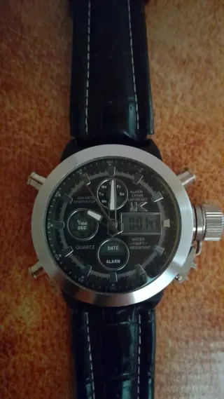 Orologio da polso uomo militare, vetro temperato antigraffio, cinturino in pelle, movimento al quarzo, sveglia, cronografo, puntatori luminosi, retroilluminato lcd per display digitale, calendario, resistente all'acqua fino a 3 atm. Mai usato perfettamente funzionante batterie nuove. Diametro quadrante 45 mm e polso 26 cm