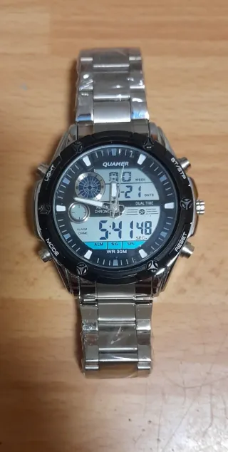 Orologio da polso uomo analogico/digitale multifunzionale, timer doppio, due movimenti, due fusi orari, ore, minuti, secondi, giorno e mese, allarme, cronografo, retroilluminazione, 4 pulsanti di controllo, resistente all'acqua 3 atm. Mai indossato ancora con pellicole protettive e batteria nuova. Quadrante 45 mm e polso 22 cm