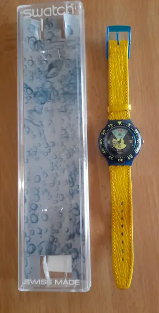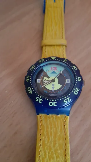 Orologio vintage anni 80 Swatch Scuba 200 Divine SDN 102, movimento quarzo svizzero, lunetta girevole, cinturino in pelle originale, resistente all'acqua 200 mt, batteria nuova e scatola originale. Perfettamente funzionante ha normali segni del tempo e un piccolo graffio sul vetro. Cassa 38 mm e cinturino 21,5 mm.