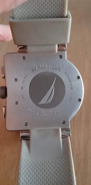 Orologio cronografo Nautica movimento al quarzo, datario. Batteria nuova ma funzionano solo le lancette dei secondi e ora le altre funzioni sono da sistemare. Con scatola originale che non si chiude bene e libretti. Diametro quadrante 45 mm mai indossato