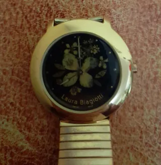 Orologio da donna vintage Laura Biagiotti movimento quarzo svizzero. Il quadrante presenta fiori veri, pressati ed essiccati, inciso il nome Laura Biagiotti e sotto la scritta Swiss Made indica l'origine e il valore artigianale dell'orologio. La cassa è placcata oro 18 carati e il cinturino in metallo estensibile. Con scatola originale e garanzia naturalmente scaduta. L'orologio è degli anni 90 perfettamente funzionante con batteria nuova, un paio di graffietti sul vetro e normali segni del tempo.