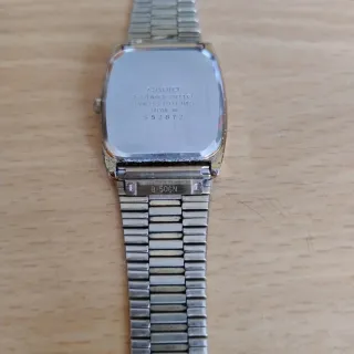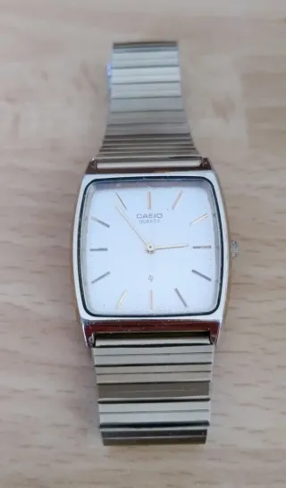 Orologio Casio vintage originale color oro, modello MG-301G made in Japan movimento al quarzo. Quadrante rettangolare chiaro, indici dorati, cinturino acciaio inox color oro, fondello in acciaio inox. Funzionante con batteria nuova, condizioni buone con normali segni del tempo sull'acciaio e qualche graffietto sul vetro. Lunghezza totale cinturino 20,5 mm. Numero di serie 552872.