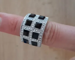 Bracciale, spilla ed anello eleganti argentati con strass e pietre: anello design geometrico con pietre nere e strass, raffinato in ottime condizioni ha solo una piccola ammaccatura sotto. Diametro 16 mm bracciale tipo tennis elastico interamente decorato con strass luminosi, classico ed elegante in ottime condizioni. Spilla gioiello con cristalli trasparenti e quattro piccoli sfumati in rosa, design raffinato ideale su giacche, foulard e cappotti. In ottime condizioni è leggermente scolorito sul retro.